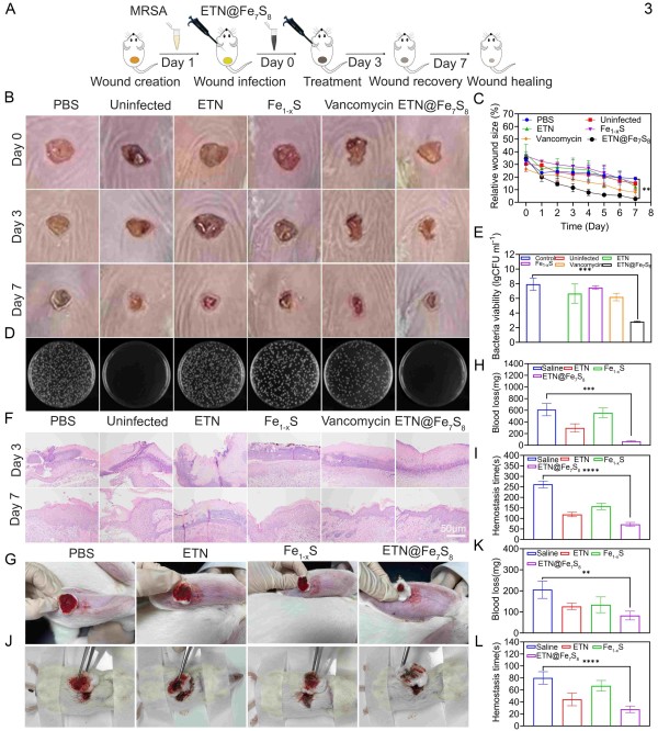 ETN@Fe7S8在MRSA感染伤口模型中具有高效抗菌、促愈合和止血功能的综合治疗效果。兔耳静脉和小鼠肝脏出血模型进一步表明其快速止血功能,有赖于ETN模板的促凝作用和铁硫化物的协同效应。